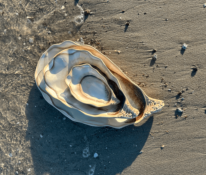 Inspireret af østersens organiske former og perlemorsglimtende farvespil er hvert fad i kollektionen et unikt kunstværk – håndlavet med omhu.